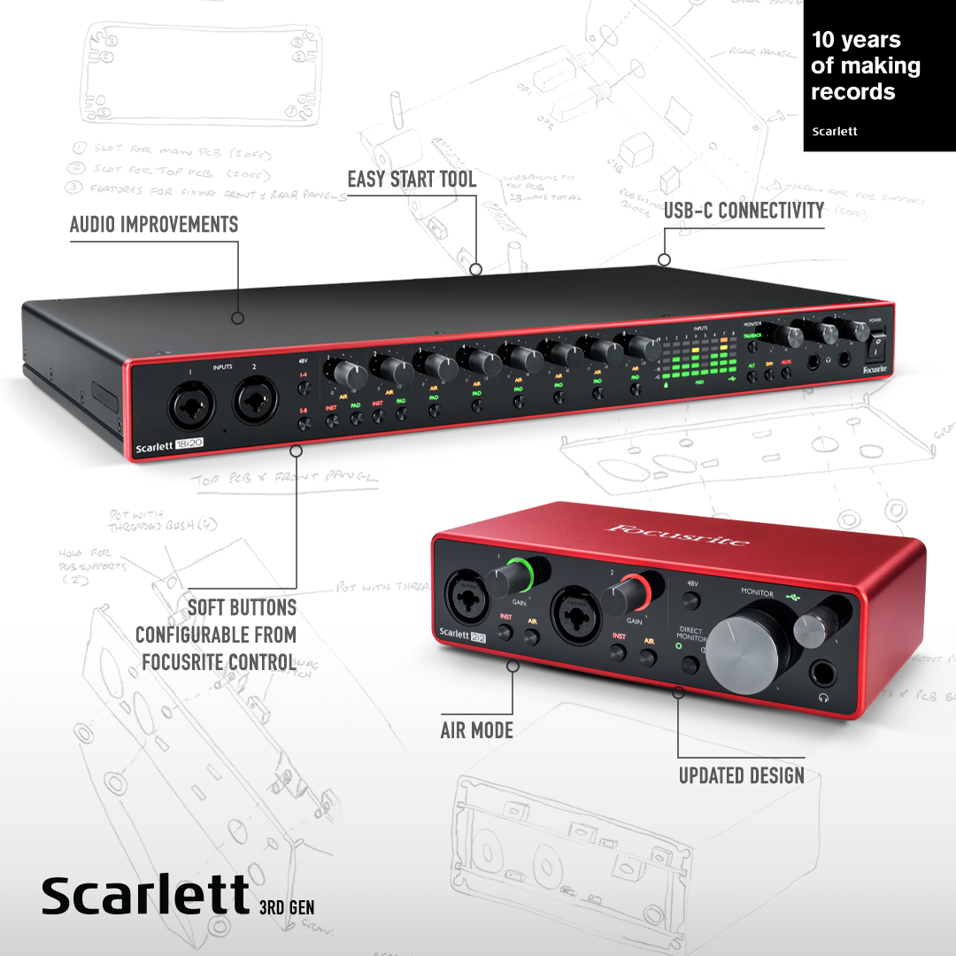 [/vc_column][/vc_row][vc_row css=”.vc_custom_1633535333065{padding-bottom: 20px !important;}”][vc_column width=”1/2″][ultimate_heading main_heading=”The First Generation” alignment=”left” main_heading_margin=”margin-bottom:10px;”][/ultimate_heading][vc_column_text]Focusrite’s Scarlett range of interfaces is celebrating ten years of making music accessible to anyone, anywhere. Thanks to over four million users across 180 countries, the high-quality audio offered by Scarlett has helped make more records than any other interface in history — and Focusrite have learned a lot in those ten years.Back then, the user experience with audio interfaces was very hit or miss. Sometimes they worked, sometimes they didn’t. For Focusrite, this wasn’t good enough. So, they made it their mission to invest in technology that would enable them to make an interface that was consistently reliable and robust, allowing everyone — not just those with tech experience — to achieve great-sounding recordings.